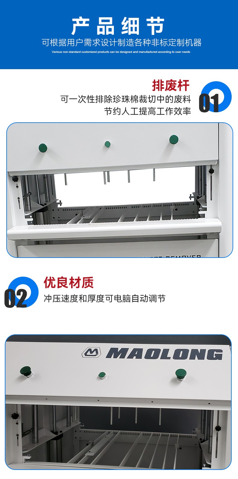 1.珍珠棉沖裁一體機(jī)一次沖壓成型排廢,省掉二次人工排廢;